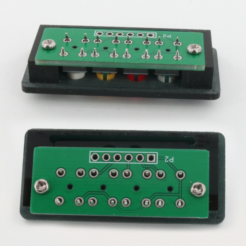 • The buttons are assembled and soldered to the PCB together with a header (not supplied) or your wiring, and then that assembly is fixed to the rear of the bezel with the supplied screws.